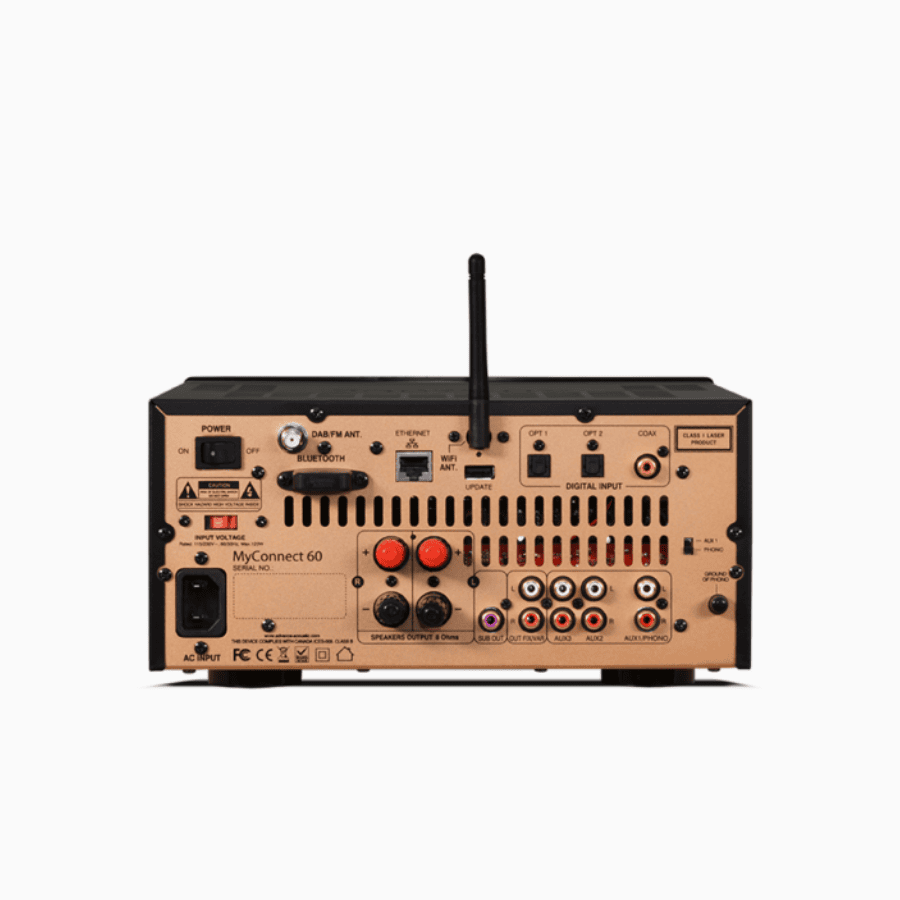 The MyConnect 60 is an audiophile « All in one » which includes a 2x60W amplifier, a wifi and ethernet network player, an FM tuner, a DAB+ tuner, a CD player, a USB player and a Bluetooth receiver.