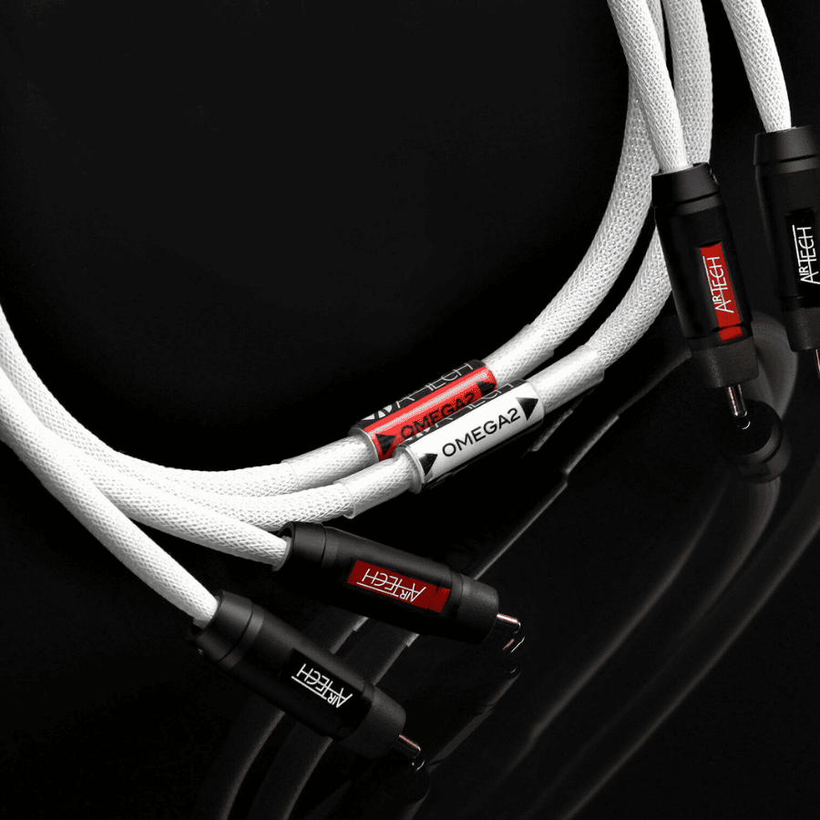 OMEGA2 RCA: pure copper conductor 22AWG Airtech 7N OCC with teflon insulation, Airtech RCA gold plated pure copper connectors, semi-balanced geometry DUALPROP Airtech with S.R.C. Cryo-demagnetized treatment, soldered with Airtech 5N solder with high percentage of copper and silver. Available with white or black sleeving.
