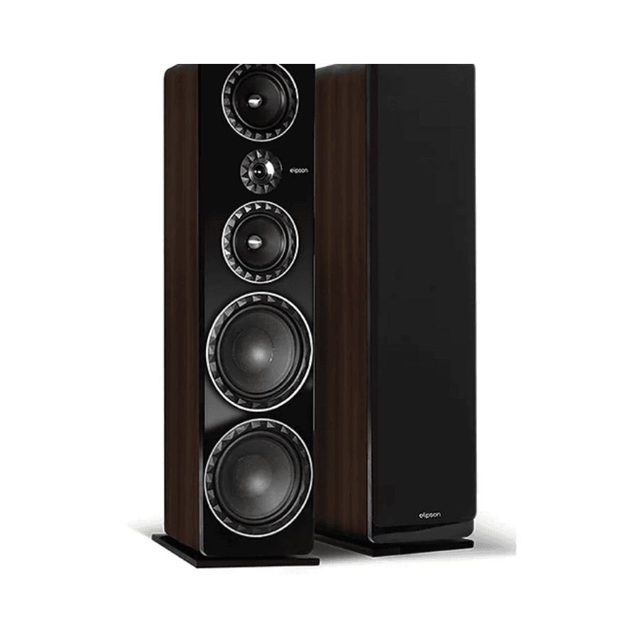 The Prestige Facet 34F is availble in black, walnut and white. Signs of a high-quality finish include a double-layer front panel to which a black or white lacquer is applied. This 3-way floorstanding speaker is equipped with two 10″ bass drivers and two 7″mid-low drivers. The latter is fitted with a bullet-shaped phase plug to limit vibrations and, consequently, reduce distortion. A 25 mm soft dome tweeter reproduces highs with finesse and precision. The multifaceted, sculpted silicone surround rings encircling each driver reduce the baffle effect and limit diffractions. The result is a more linear response curve and a smoother listening experience.