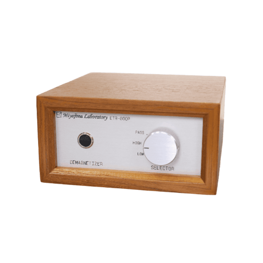 I have regarded clear sound and low tone quality as important not to spoil a good point of Cartridge. I think that stepup transformer ETR-800P acts on not only Miyajima-Lab’s Cartridge but also the cartridge of other companies effectively.- ETR-800P is installed in a beautiful TEAK case. – The calking material is « paraffin » – Highest grade core material, permalloy 80 for the core of the transformer is used. – There is a changeover switch of Low,High,Pass. – The left button is a demagnetization function. Demagnetizer |