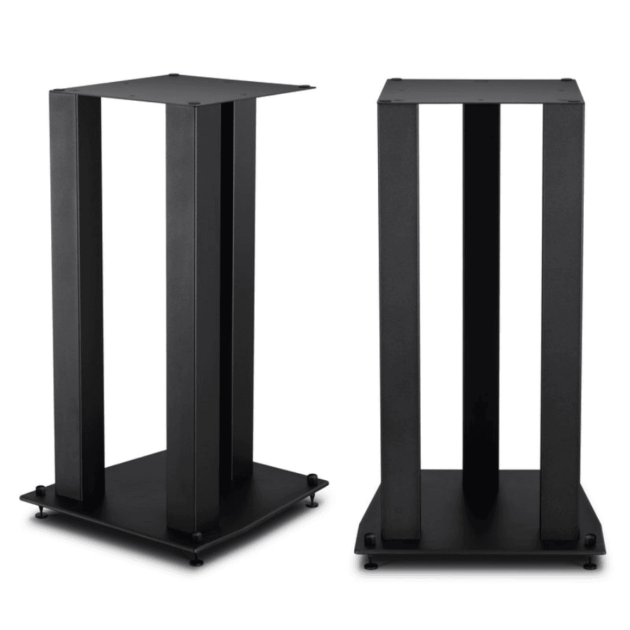 Custom-made for Mobile Fidelity SourcePoint 10 bookshelf loudspeakers, these 22-inch-tall stands raise your speakers to the ideal listening height and provide vibration-resistant support. Made of steel, the four-pillar design can also be filled for extra stability. The top plate measures 10 x 10 (WD) inches and is 0.125 inches thick; the base plate measures 14 x 15 (WD) inches and is 0.375 inches thick. Sold in pairs. Each set comes with spikes, spike plates, and neoprene and felt pads.