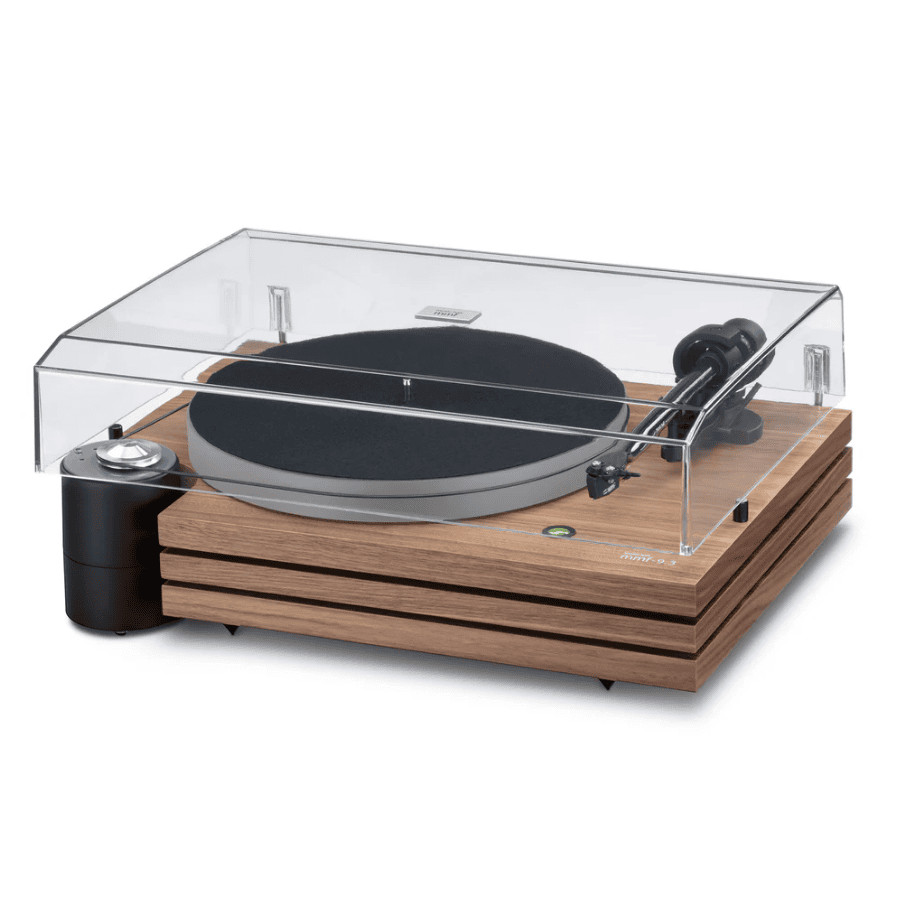 The optional Goldring Eroica LX low-output moving-coil cartridge with Gyger II line contact stylus ($795 value) ensures stunning sound quality. The cartridge supplied is properly aligned and mounted. Other features include an inverted ceramic main bearing for super quiet, fluid operation, non-resonant 1” thick acrylic platter, soft felt platter mat, high-quality gold RCA connectors, and adjustable tip toe feet with anti-scratch cups. With a low noise, fully manual belt drive design, built-in round spirit level for proper leveling, dust cover, and 45 rpm adaptor included, the MMF-9.3 is a top choice for audiophiles.