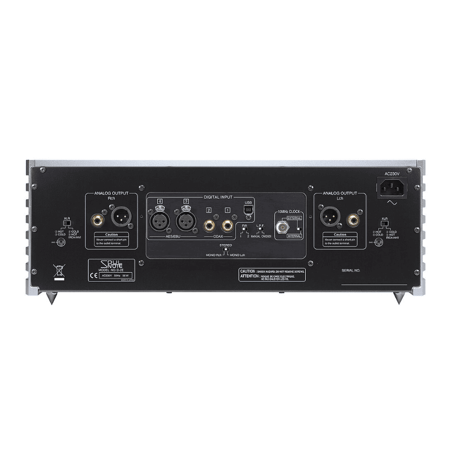 The D-2 incorporates the newly developed power transformers with eight windings on the secondary side that are capable of regulation similar to that of very high power amplifiers. Independent rectifier circuits in each stage prevent interference. Because transformers are a source of vibration, SOULNOTE has used only one in each unit to simplify the vibration type and has constructed the unit body so that any unwanted vibrations are transmitted away from the body through a spike placed directly under each transformer.